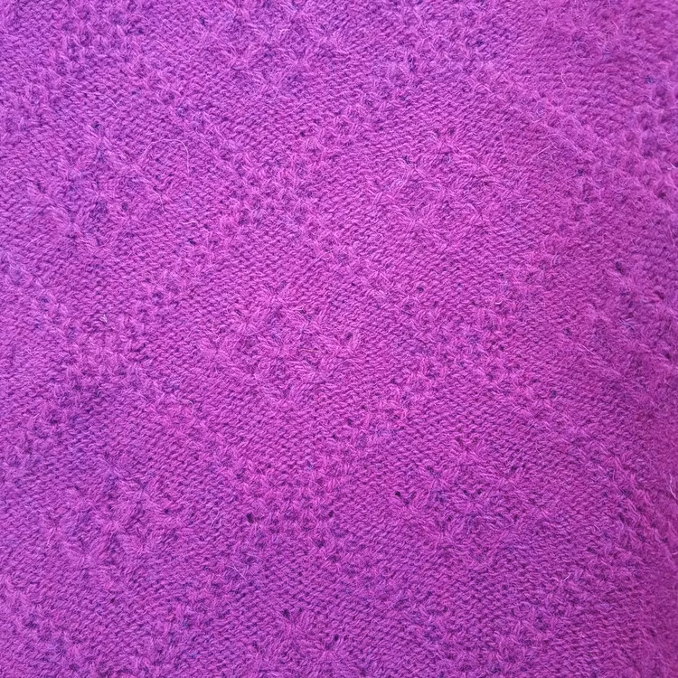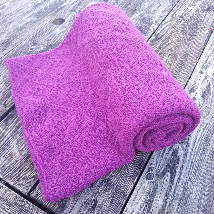 Filt stickad på handstickningsmaskin i 100% mjuk ull i ett rutigt mönster med lyfta maskor. Den är sedan lätt tovad i tvättmaskin, vilket gör filten mjuk och följsam.