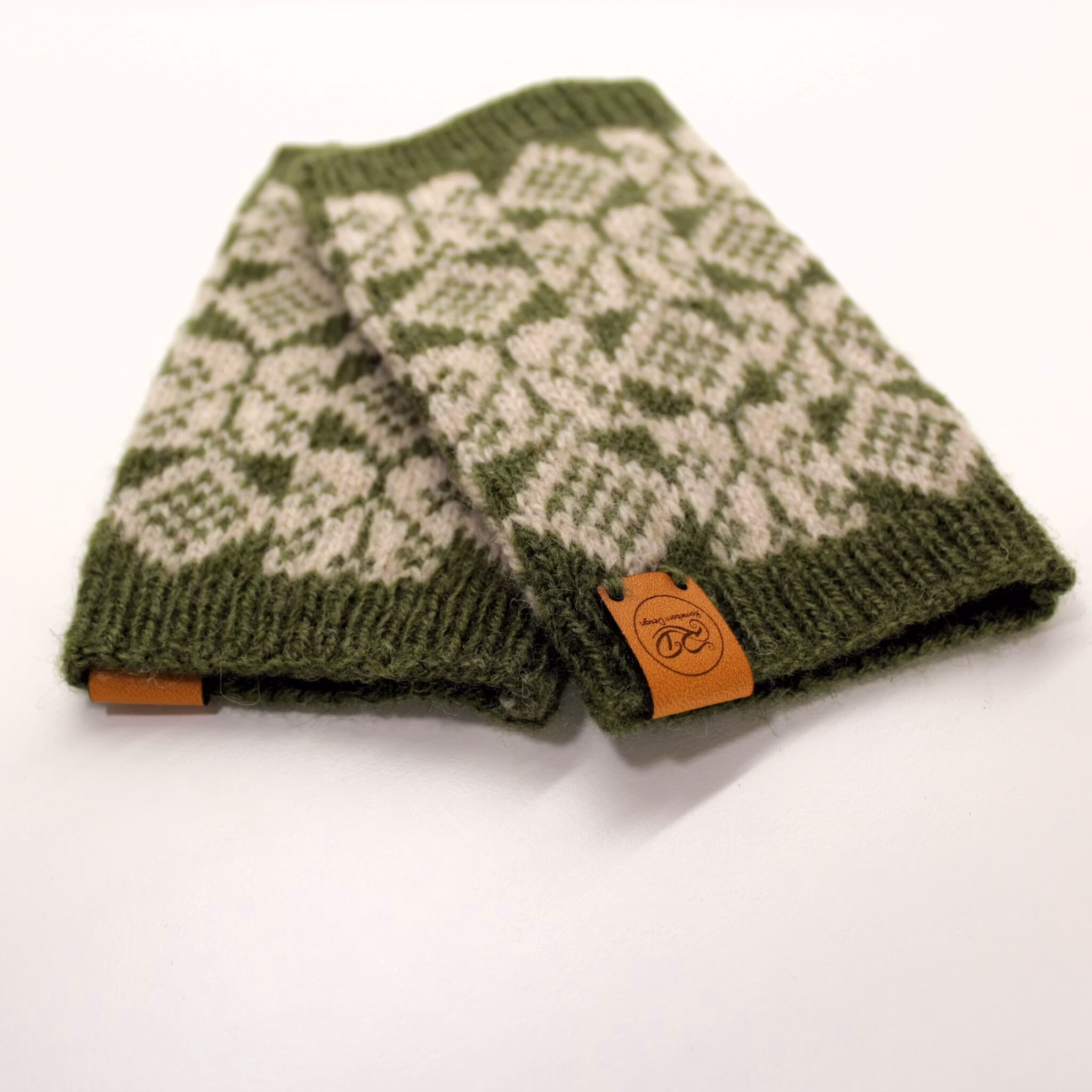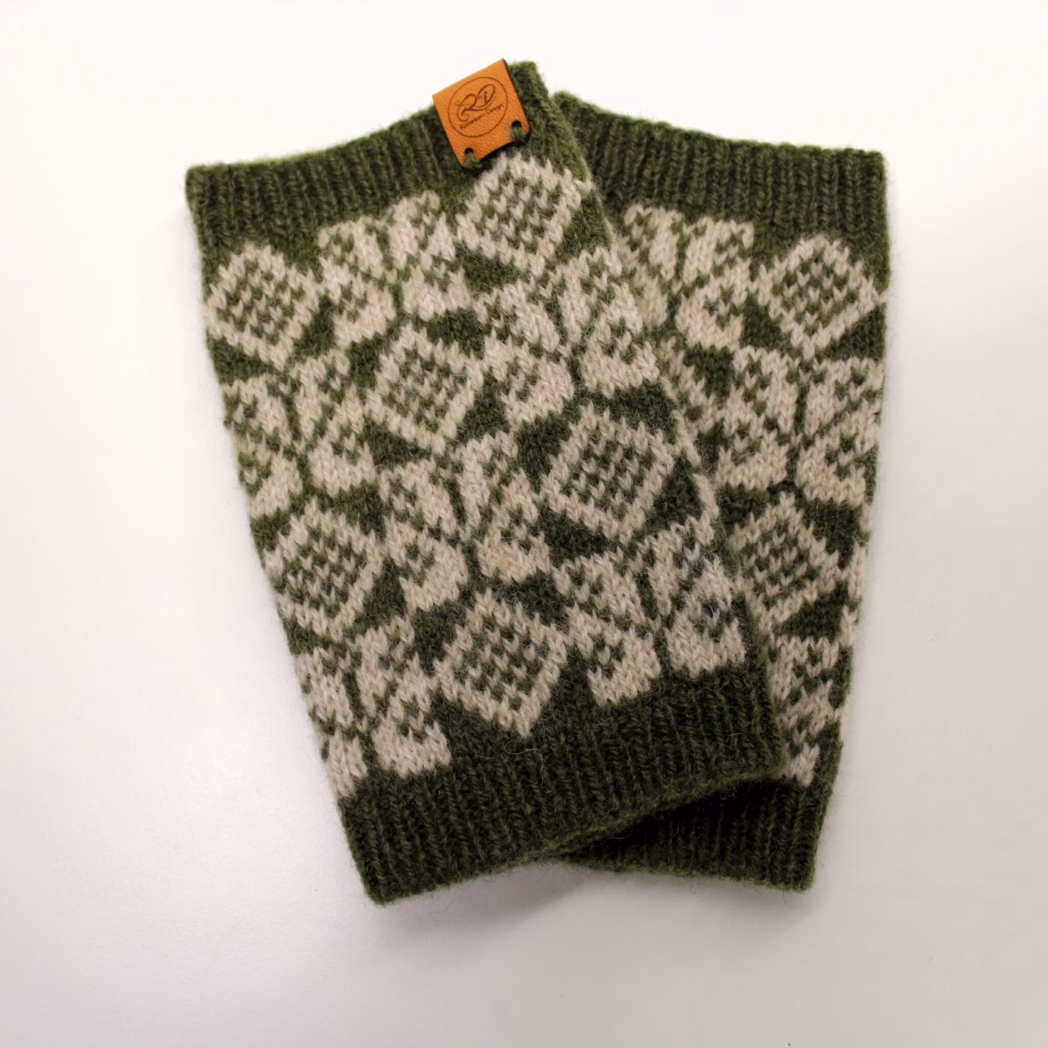 Handledsvärmare i min version av det halländska bingemönstret Blomster. I sidan finns ett praktiskt hål för tummen.