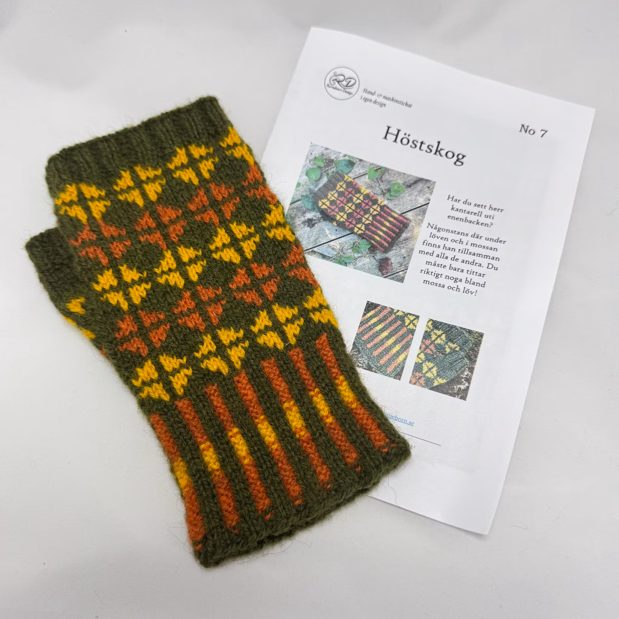 Kit med det material du behöver för att sticka halvvante Höstskog. Mönstrets färger är inspirerat av skogens mossa och höstens färger.