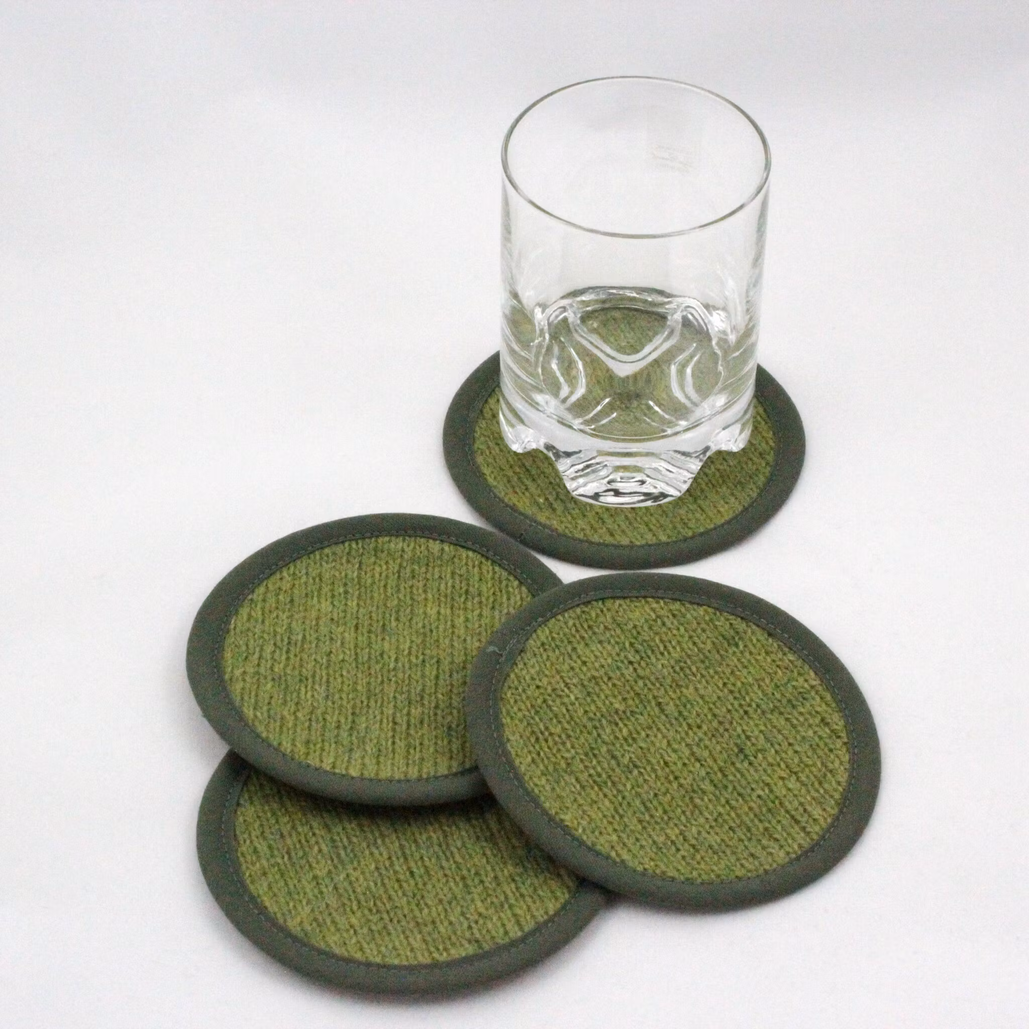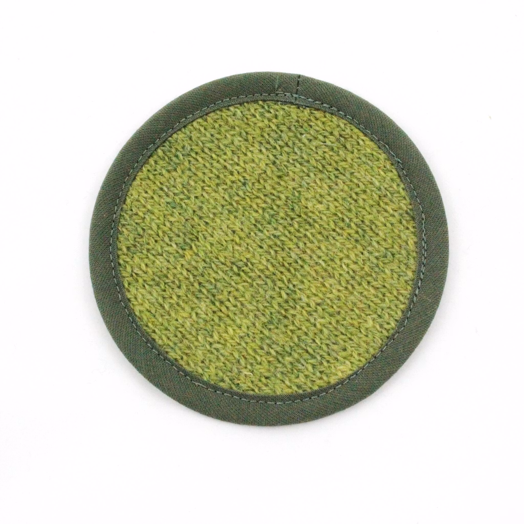 Coaster/underlägg med stickad ovansida och udnersida i bomull. Passar perfekt till tekoppen eller glaset, är snygga och skyddar samtidigt ditt bord från repor och fukt.