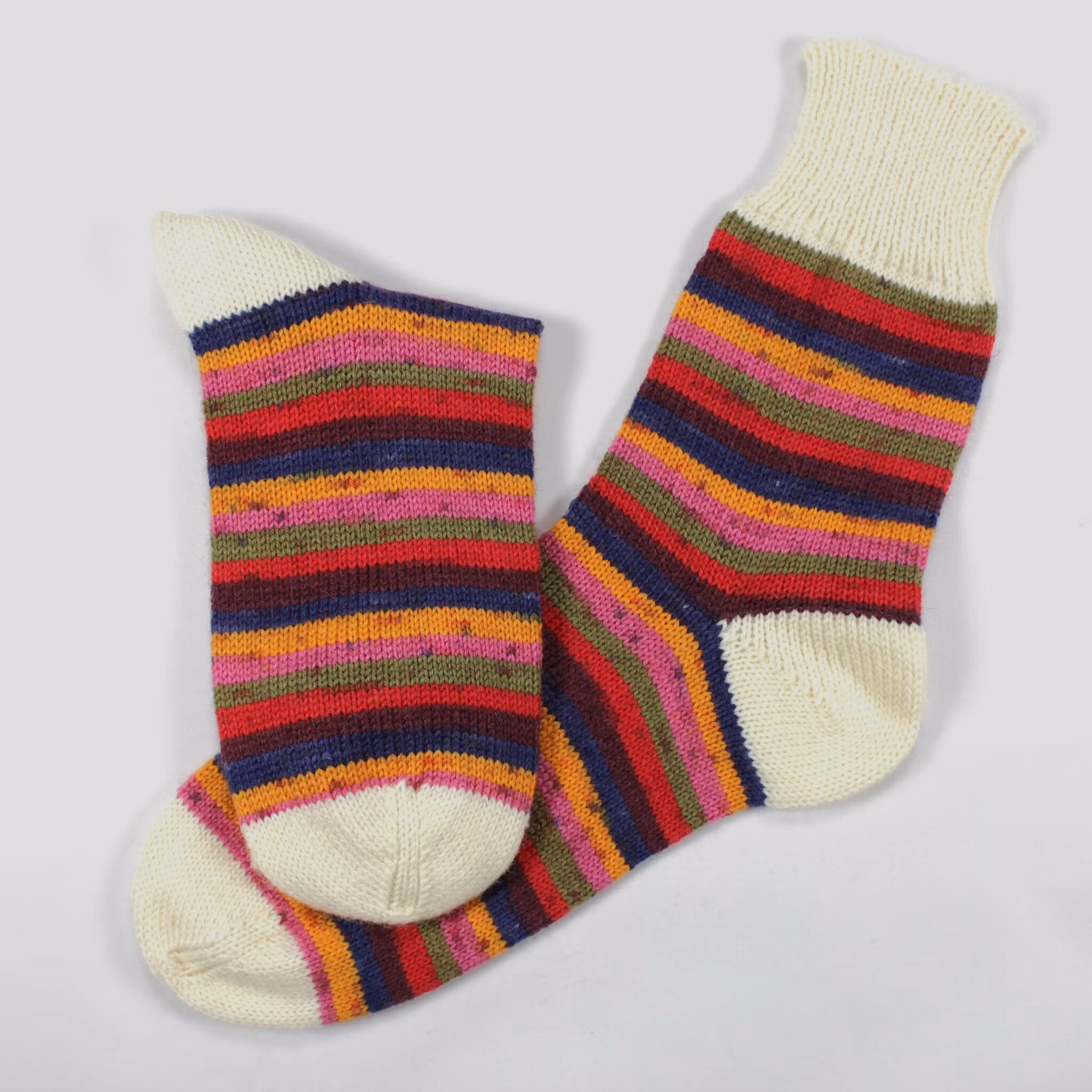 Ullsockar i lite tunnare garn och funkar därför bra i vanliga skor. De är stickade av mig på handstickningsmaskin.