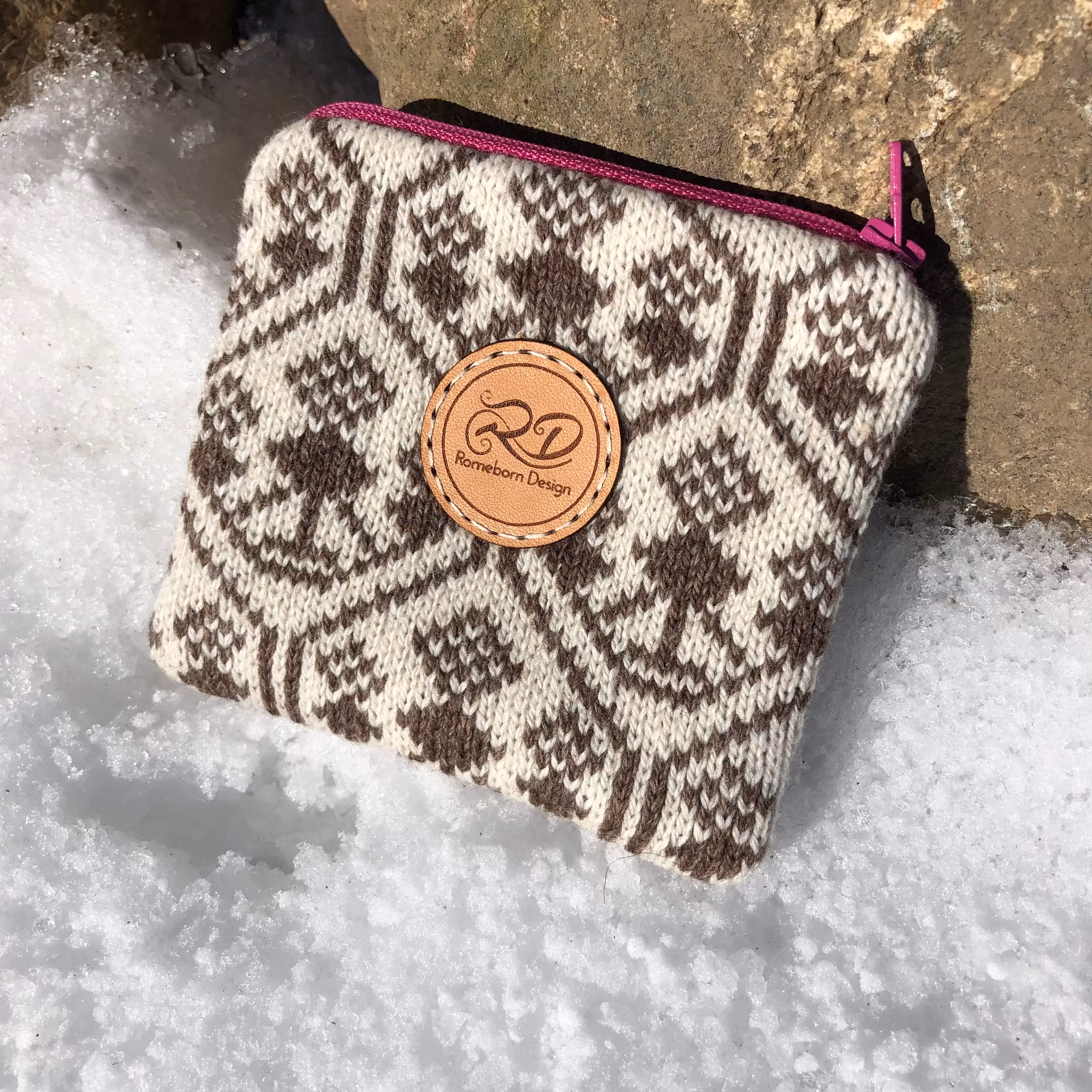 Liten börs för småsaker, tex stickprylar, småpengar eller något annat du vill ha ordning på. Mönstret är min egen variant på det halländska bingemönstret Bjärbo. Varje börs är unik och fodrad med matchande tyg på insidan.